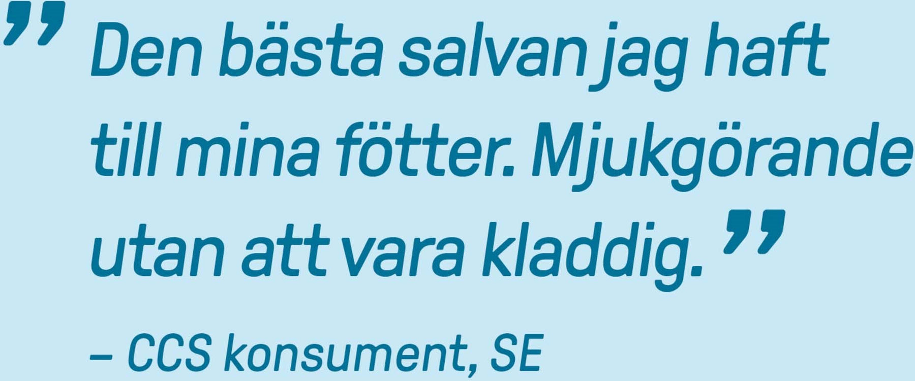 CCS Fotvårdssalva innehåller en hög halt fuktbindande karbamid. Salvan mjukar upp förhårdnader och gör fötterna lena och mjuka. CCS Fotvårdssalva innehåller även svalkande eucalyptusolja som ger fötterna en fräsch doft. Bäst effekt har salvan om den får verka över natten. Sov gärna med strumpor för extra bra effekt. Karbamidhalten är 10%, fetthalten är 28%.