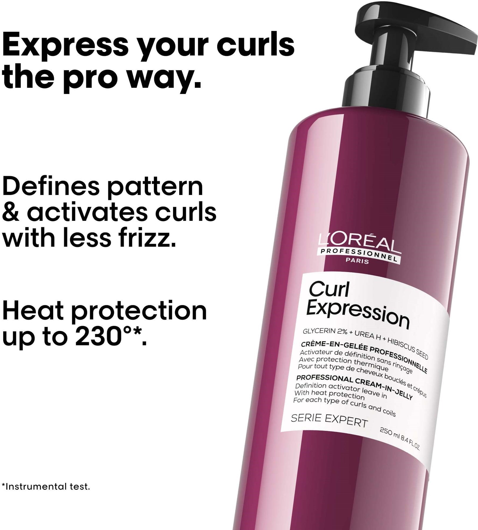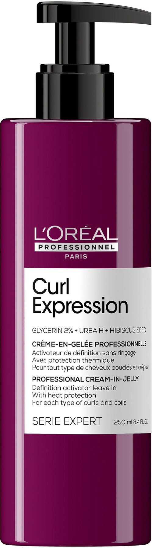 L'Oréal Professionnel Serie Expert Curl Expression Cream-in-Jelly Definition Activator Leave-in, för alla typer av lockigt och krulligt hår. Denna formula, som är berikad med glycerin 2%, Urea H och hibiskusfröextrakt, definierar mönstret och aktiverar lockarna. De blir väldefinierade och utan krus*. Värmeskydd upp till 230 °.