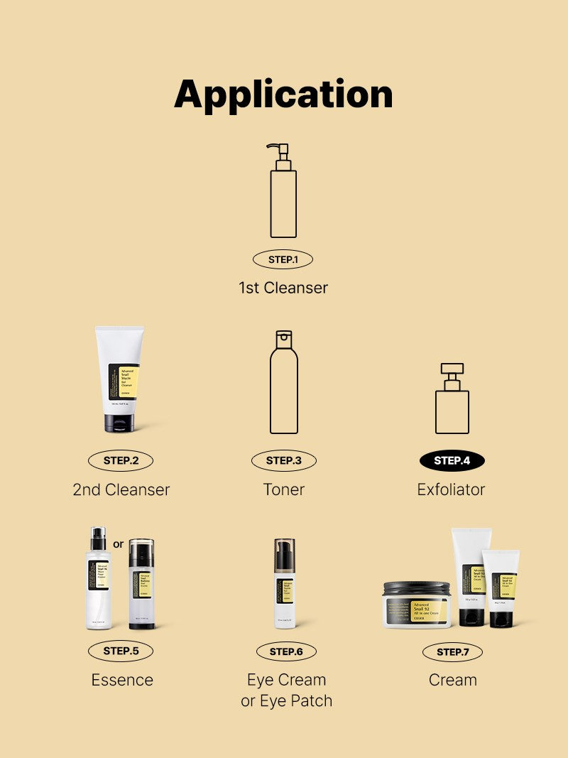 Efter rengöring och toner, applicera ett pump snail mucin jämnt över hela ansiktet. Klappa försiktigt med fingertopparna för att underlätta absorbering. Vid behov, applicera flera lager. Avsluta med fuktkräm.