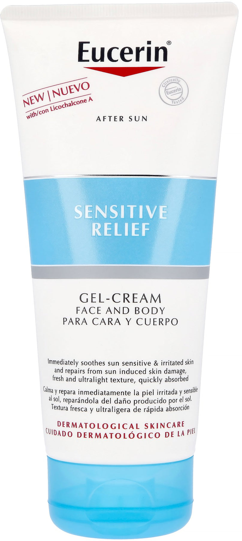 Eucerins after sun har en ultralätt och kylande gel-creme formula. Den absorberas snabbt och ger intensiv återfuktning vilket hjälper huden att återhämta sig efter solexponering. Formulan med Licochalcone A lugnar den solstressade och irriterade huden och minskar rodnad. Glycyrrhetinic acid stöttar hudens egen förnyelseprocess.Produkten kan användas i ansiktet och på kroppen. Milt parfymerad.