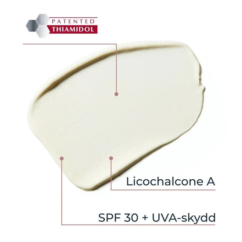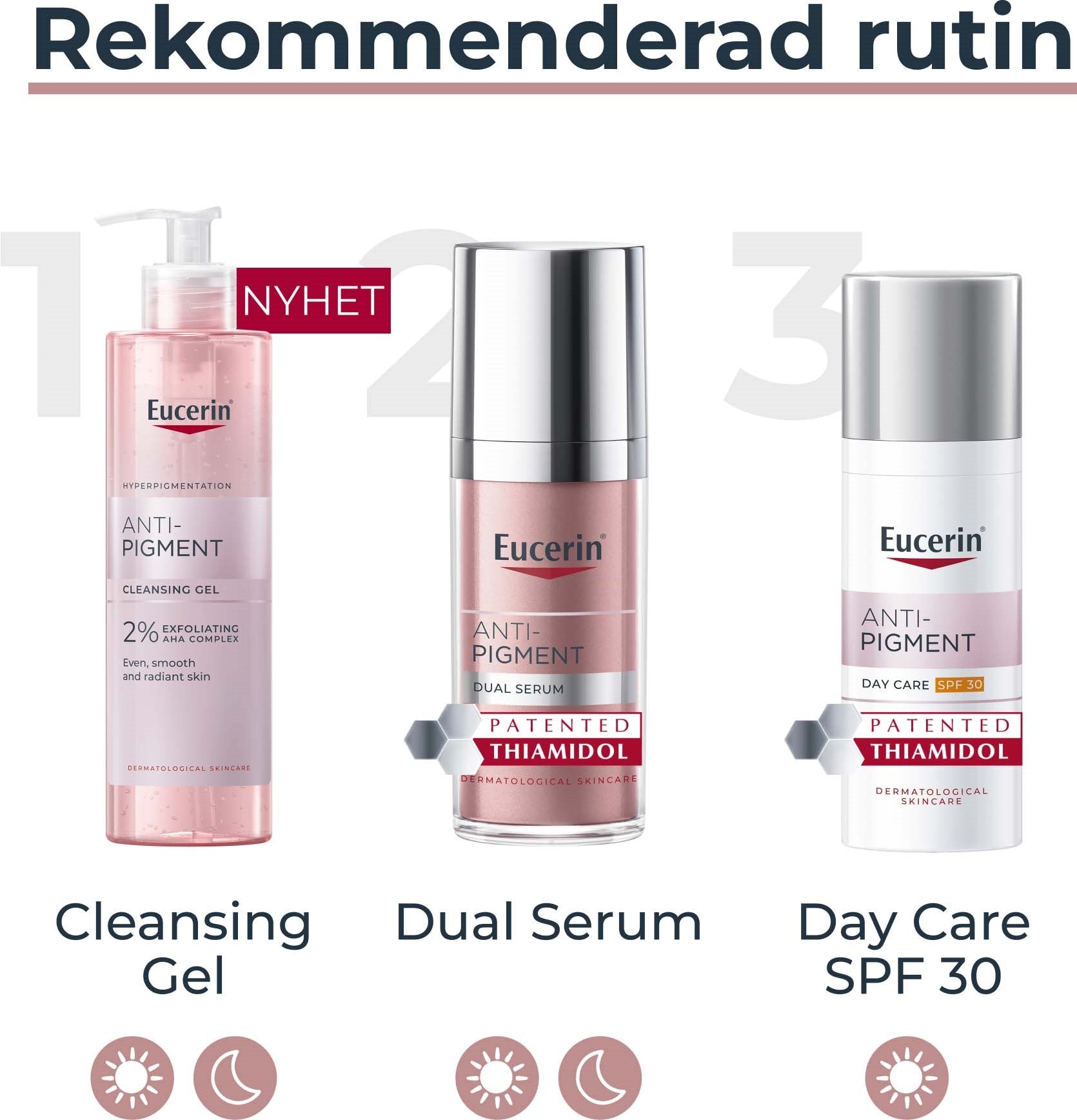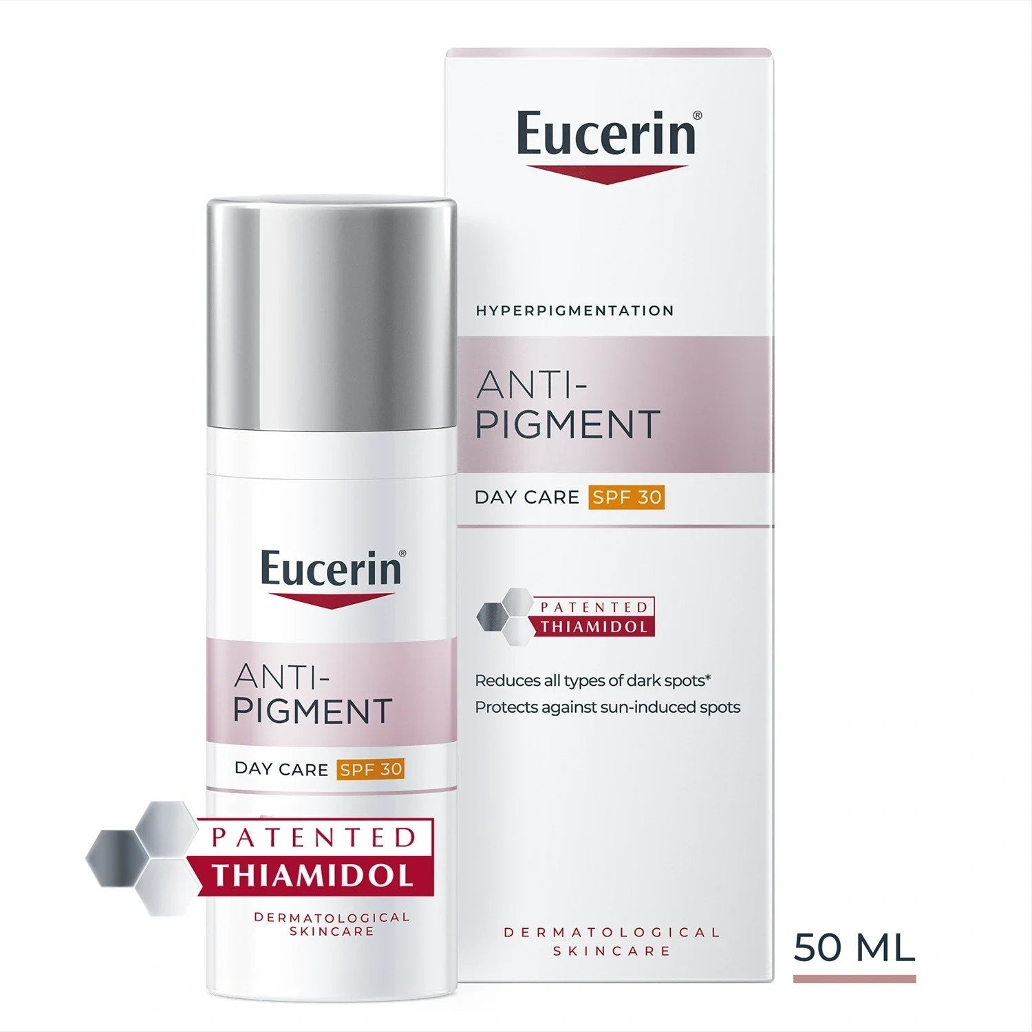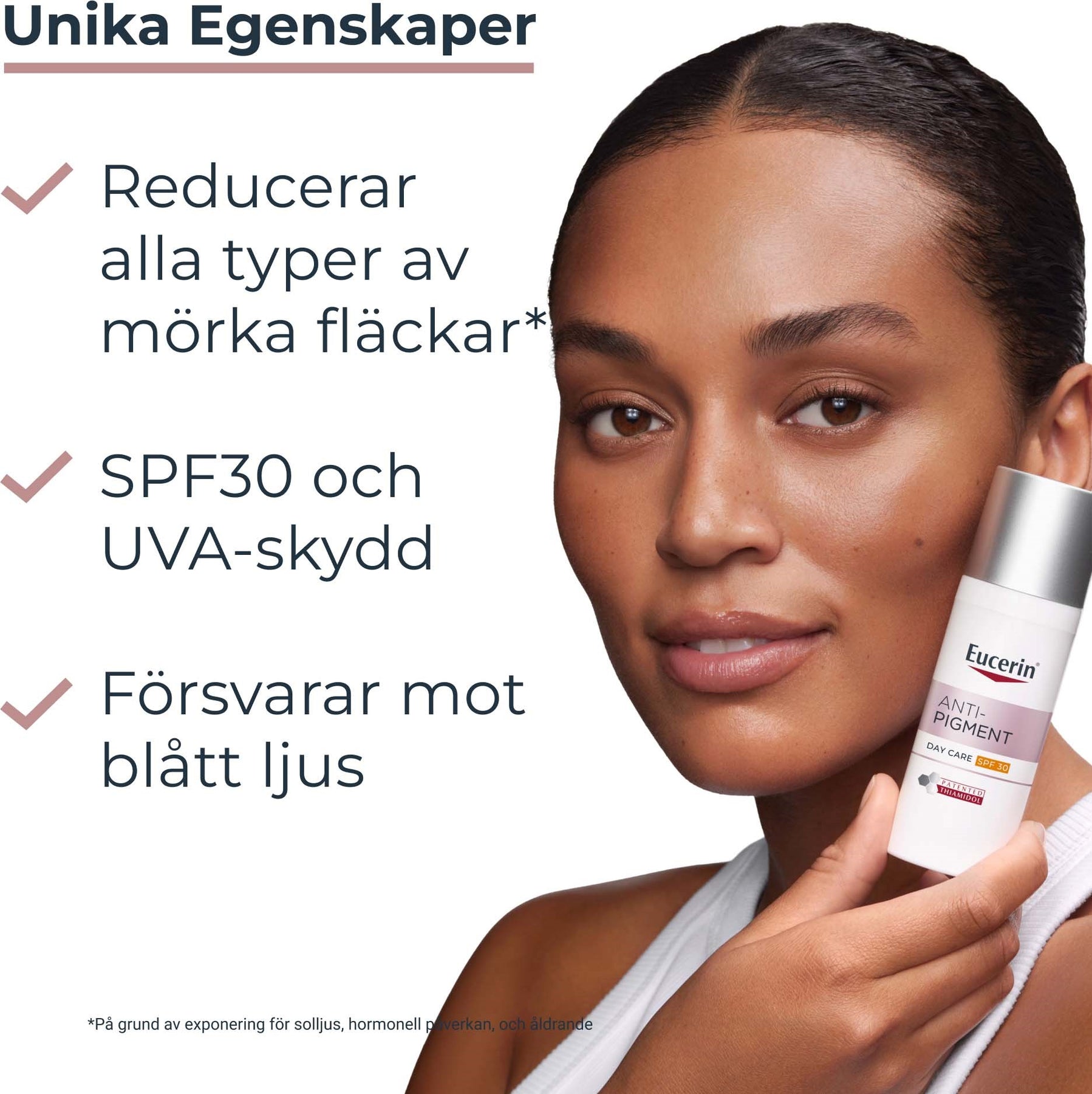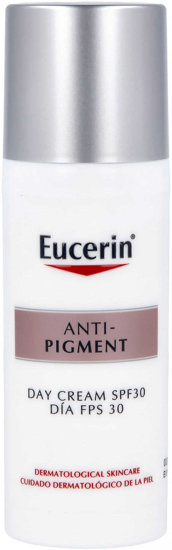 Eucerin Anti-Pigment Day Cream med SPF30 är en dagkräm som förebygger och reducerar pigmentfläckar i ansiktet.Eucerin Anti-Pigment innehåller den patenterade ingrediensen Thiamidol. Thiamidol ska motverka hyperpigmentering, något som kan orsakas av en överproduktion av melanin (hudens pigment) och bilda mörka fläckar på huden. Eucerin Anti-Pigment dagkräm reducerar produktionen av melanin, och krämen innehåller SPF 30 + UVA för att skydda mot pigmentfläckar orsakade av UV-strålar. Passar alla hudtyper. Milt parfymerad.