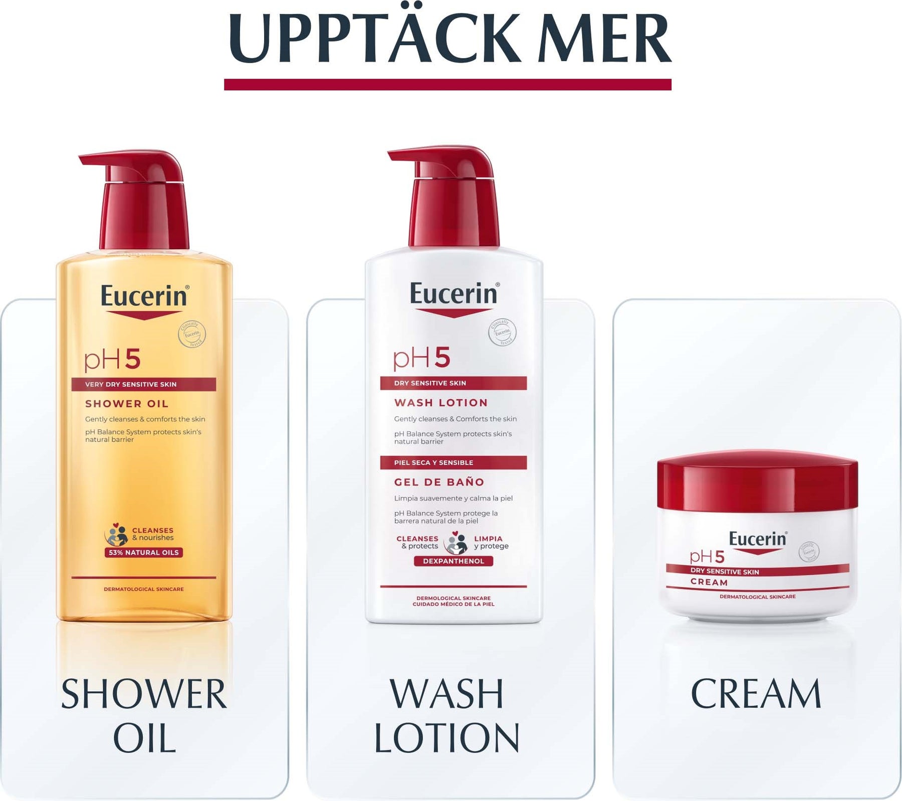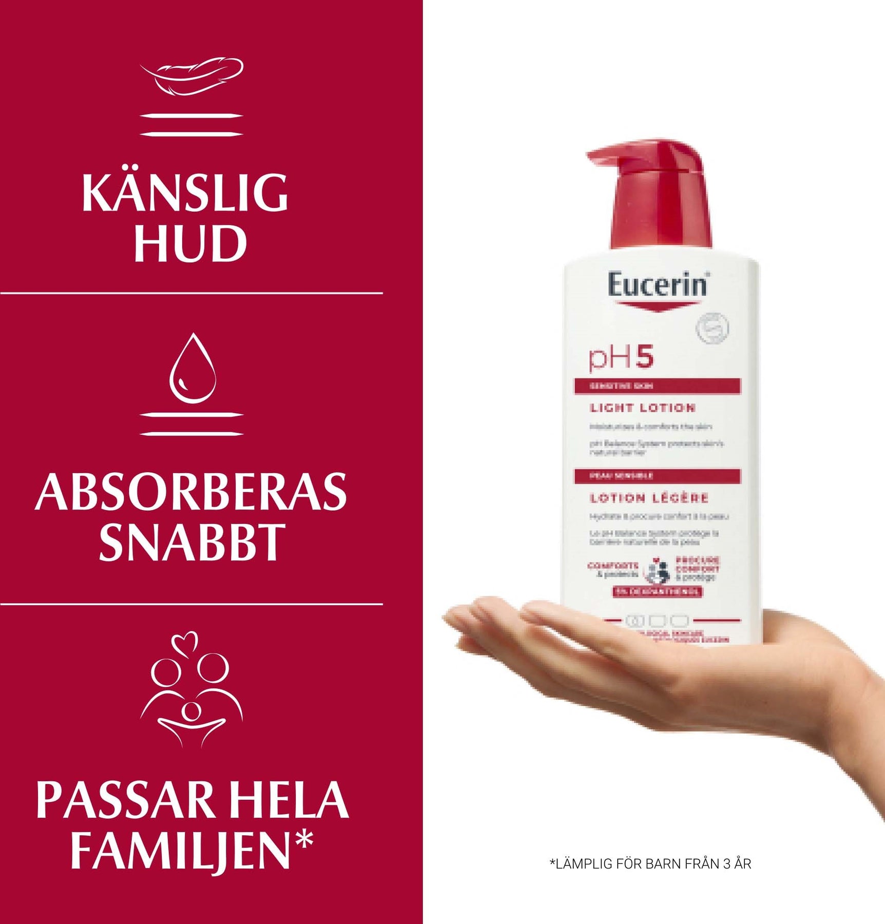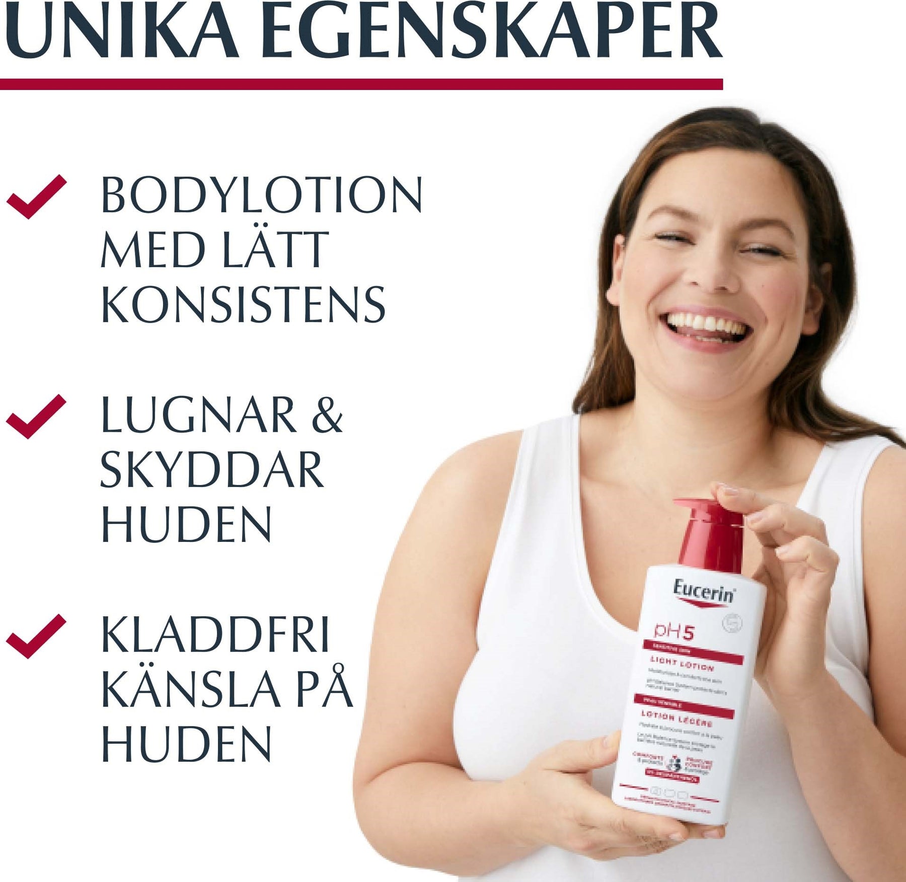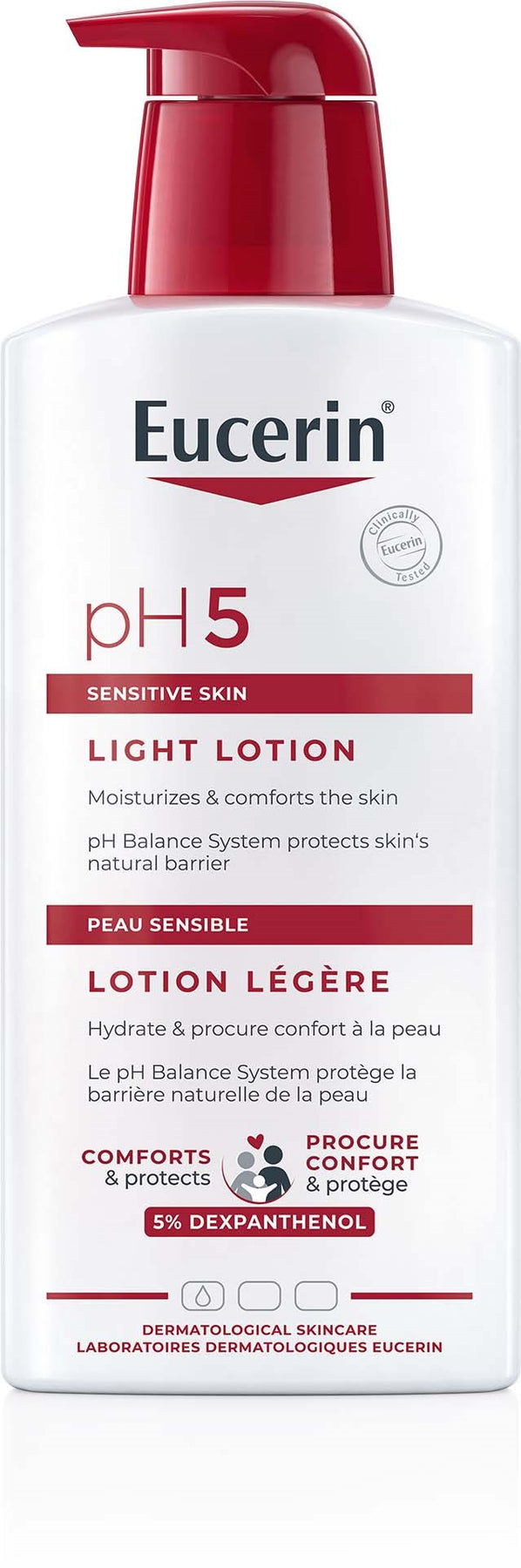 Eucerin pH5 Light Lotion är en extra lätt bodylotion för torr eller känslig hud. Den har en gelkonsistens som snabbt går i huden utan att kladda. Den har ett optimalt pH-värde för att stärka hudens naturliga försvar. Produkten är milt parfymerad. Den har en pump som gör applicering enkel.