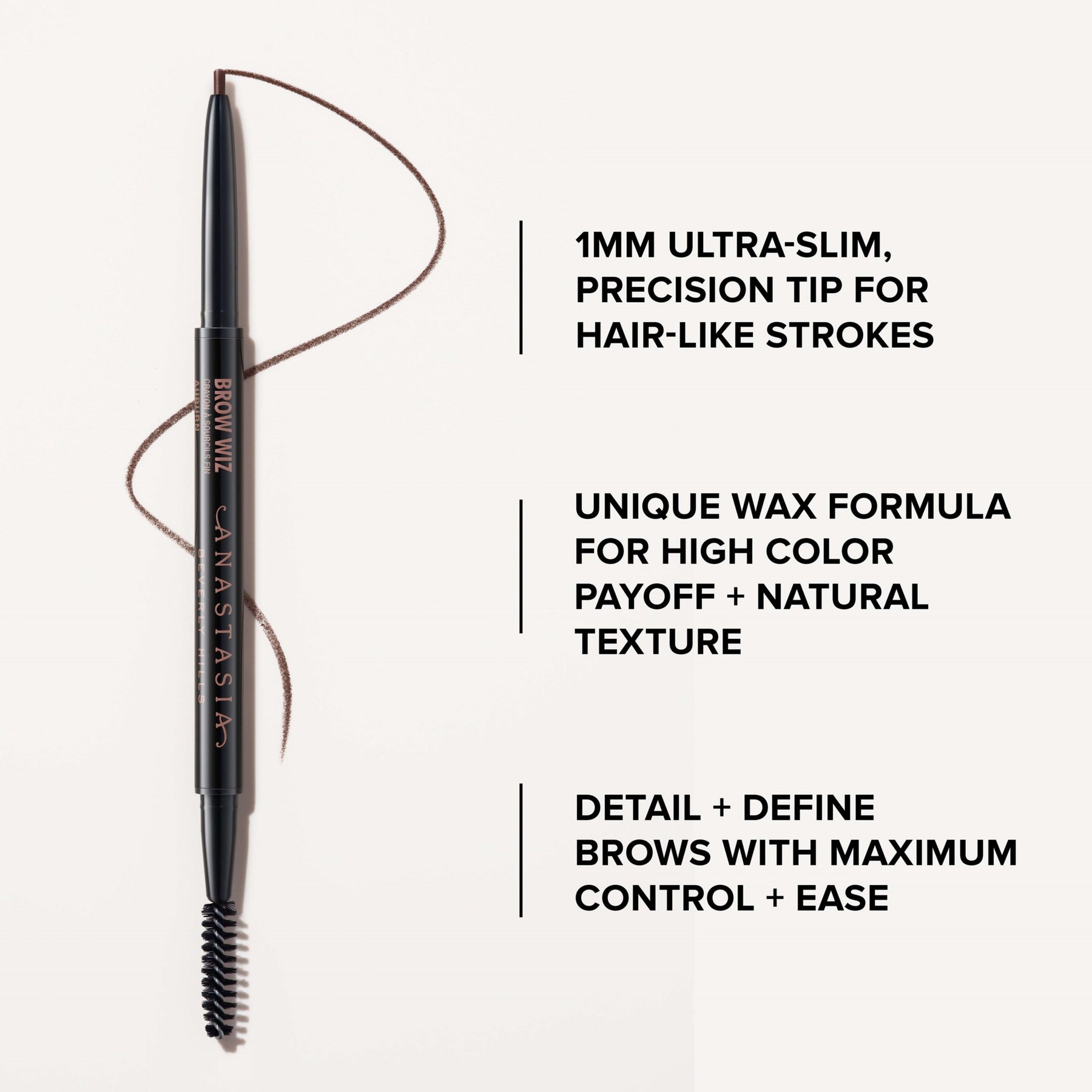 Anastasia Beverly Hills Brow Wiz är en ultratunn, retraktabel ögonbrynspenna som är utformad för att lägga till definition och hårliknande detaljer till ögonbrynen med maximal precision och kontroll. Finns i 12 nyanser. Den unika vaxformulan har en perfekt blandning av ögonbrynsfärg och vax för att leverera hög färgutdelning och efterlikna utseendet av hårliknande textur för naturligt utseende ögonbryn. Den ultratunna, 1 mm spetsen skapar hårliknande drag - perfekt för glesa partier, medan den anpassade spoolie-borsten blandar för en naturlig finish.