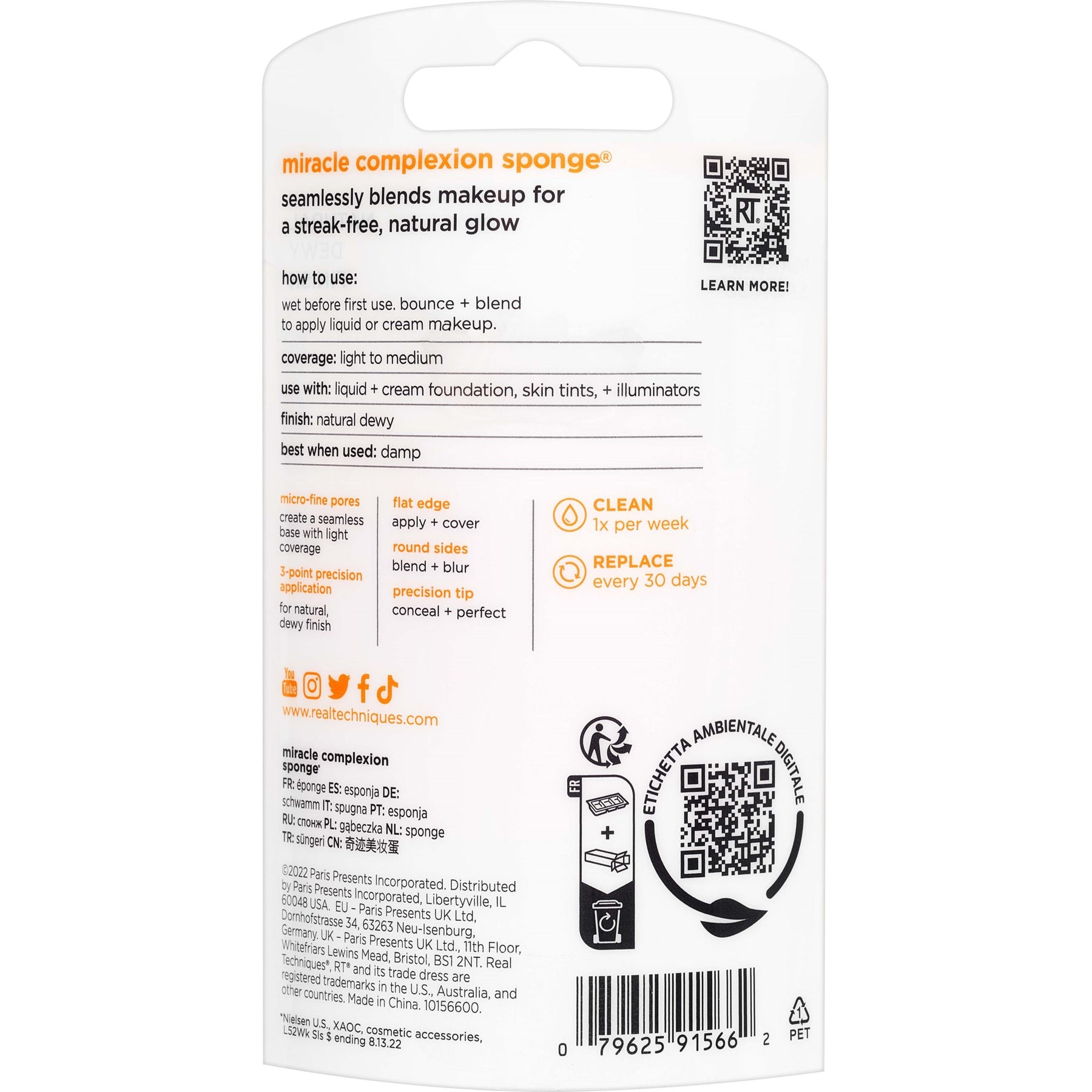 Real Techniques Miracle Complexion Sponge erbjuder tre fördelar i en produkt, upptäck skillnaden i din makeup rutin med en sponge som kan användas för att applicera foundation, täcka finnar och andra små skavanker samt concealer under ögon och kring näsa. Men inte nog med det - Miracle Compexion Sponge har ytterligare fördelar som att den kan användas till crèmerouge samt för att med puder matta ner i T-zonen och fixera de första två stegen. Användning: Fukta Miracle Complexion Sponge lätt med vatten innan applicering av flytande produkter för att minska risken att produkten absorberas in i svampen. Applicera foundation genom att dutta eller med lätt tryckande rörelser arbeta in den på huden med den rundade delen på miracle sponge. För att lägga produkt under ögonen rekommenderas användning av den platta toppen på miracle sponge.